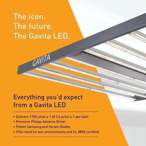 The Gavita Pro 1700e LED is a high-output, full-spectrum grow light designed for full-term plant growth, from vegetative to bloom stages. It features 8 passively cooled LED bars, delivering broad and intense light coverage, suitable for various growing setups like low rooms, vertical racks, and tents.
